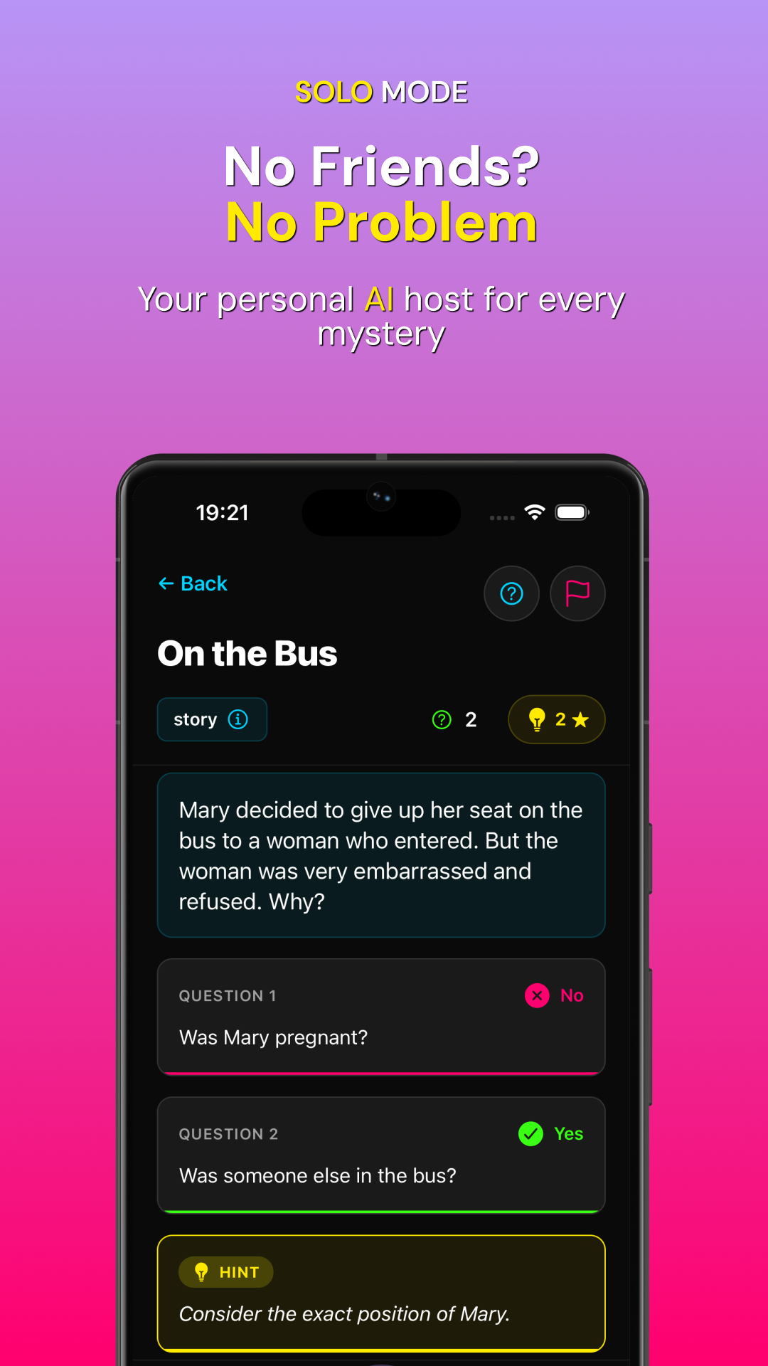 Solve intriguing mysteries through yes/no questions! A unique lateral thinking game that challenges your deduction skills.